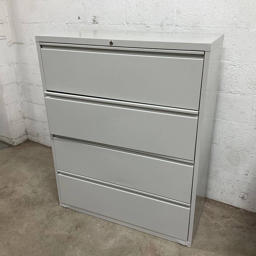 Durable lateral filing cabinet for office use with three spacious drawers and a lockable top drawer.