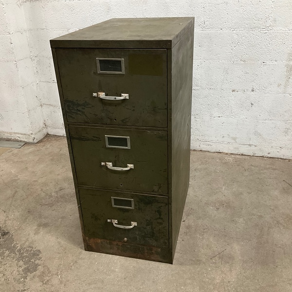 Vintage metal filing cabinet with four drawers. Ideal for office or industrial decor. Sturdy construction from mid-20th century.