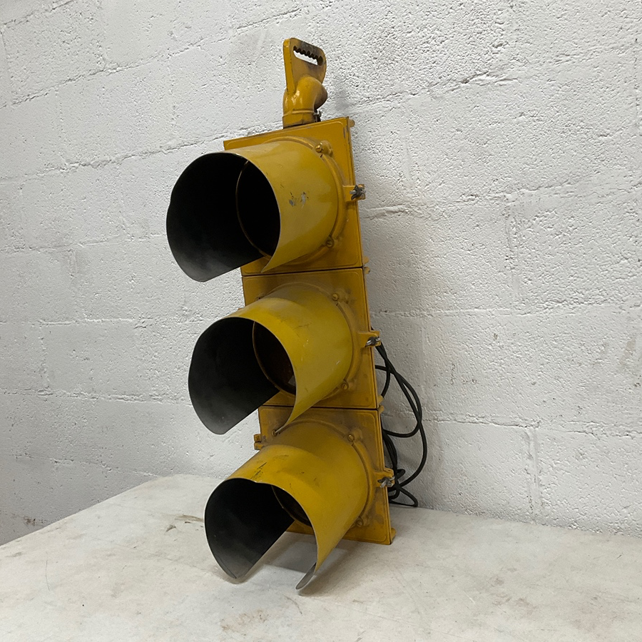Mid-20th century traffic signal light with yellow body and three black visors. Ideal for industrial or urban-themed decor.