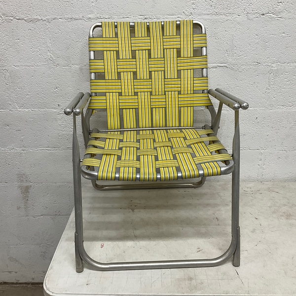 Mid-century folding chair with yellow web seating. Features a lightweight aluminum frame ideal for patios and outdoor spaces.