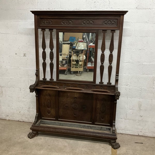 Elegant hall tree with mirror and intricate carvings. Perfect for vintage-style entryways.