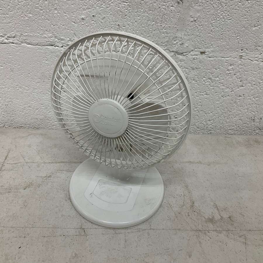 Compact white electric fan for desktop or table use. Ideal for small rooms and offices. Features a sturdy base and easy portability.