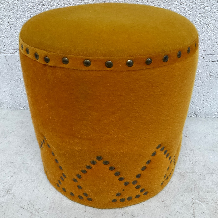 Vintage-style round ottoman in mustard yellow fabric with brass stud detailing. Ideal for living rooms or bedrooms.