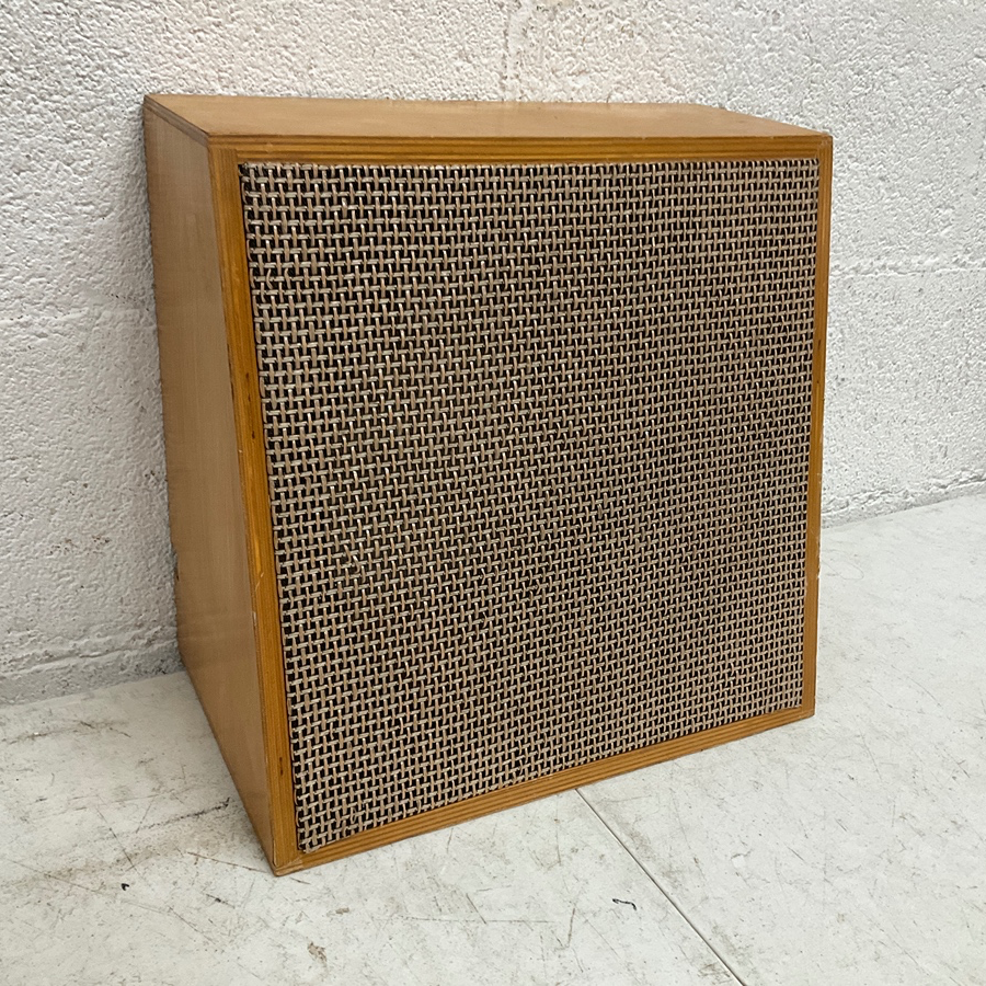 Vintage speaker cabinet with a wood finish and woven fabric grille, ideal for mid-century decor.
