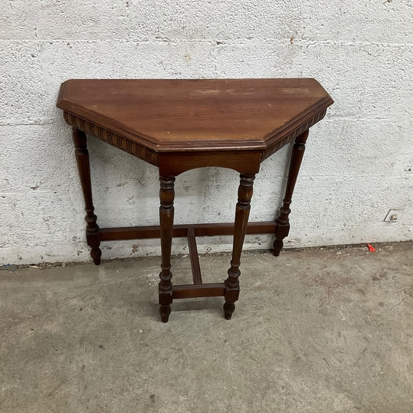 Vintage wooden corner table perfect for small spaces. Ideal for living rooms or hallways, with elegant carved legs.