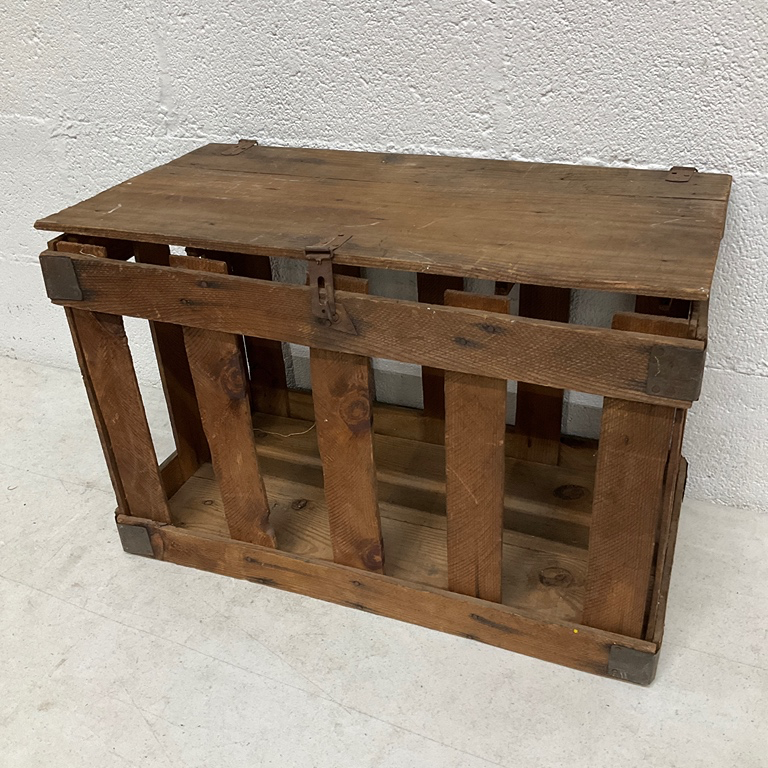 Antique wooden crate for storage, featuring a hinged lid and robust construction. Ideal for rustic decor in living rooms or storage spaces.