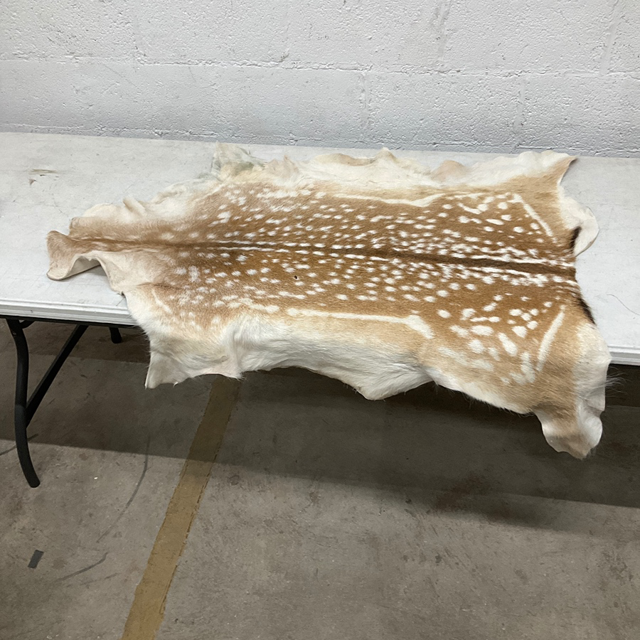 Natural spotted deer hide rug for rustic or cabin decor. Soft texture, suitable for living rooms or dens. Authentic and unique.