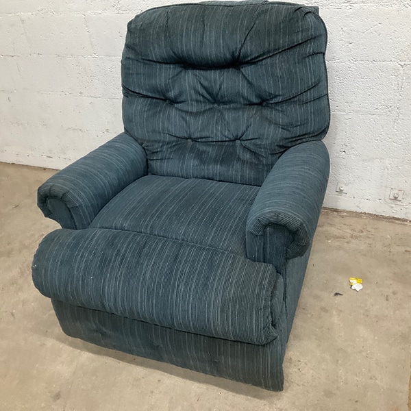 1980s tufted recliner chair with blue upholstery, ideal for living rooms. Features padded armrests and plush seating.