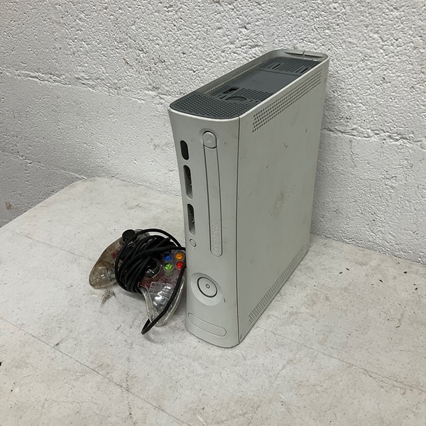 Xbox 360 console with a wired controller. Suitable for gaming in living rooms or entertainment setups. Features white exterior.