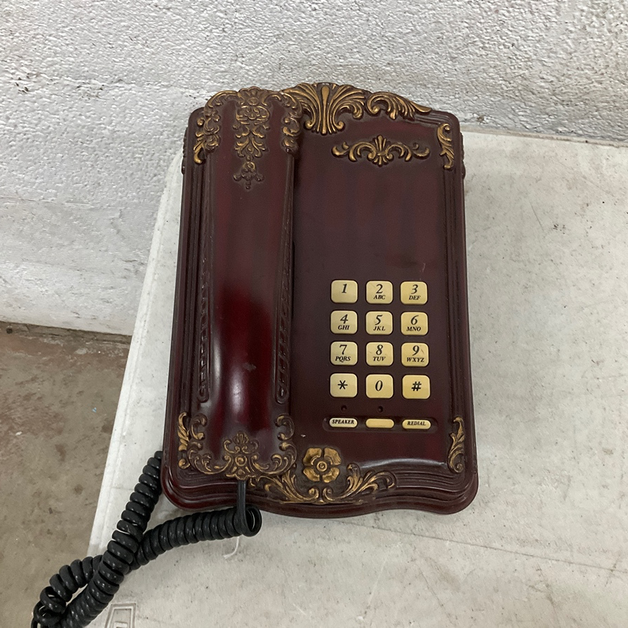 Classic corded telephone with ornate gold details. Perfect for retro-themed rooms or vintage decor.