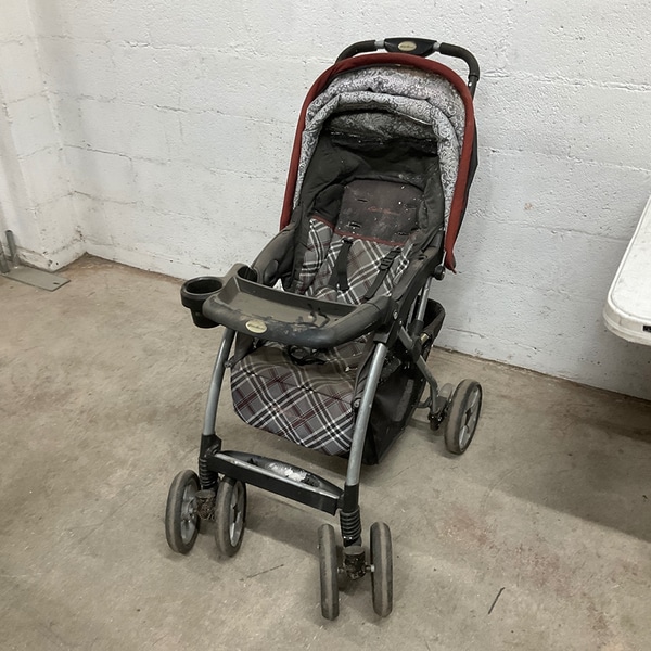 Foldable baby stroller featuring a plaid pattern, a canopy, and a comfortable padded seat. Ideal for daily walks.