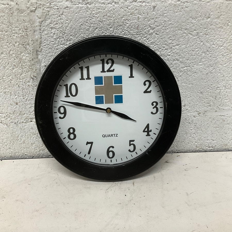 Classic round quartz wall clock with bold numbers. Ideal for kitchens or offices. Sturdy black frame.