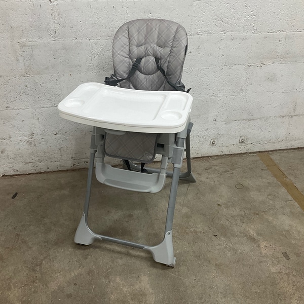 Padded high chair with safety harness, ideal for kitchens or dining areas. Features a detachable tray and modern design.