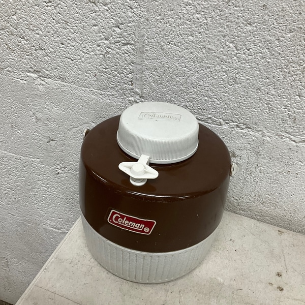 Classic Coleman insulated water cooler jug from the 1970s. Brown and white design ideal for outdoor activities.