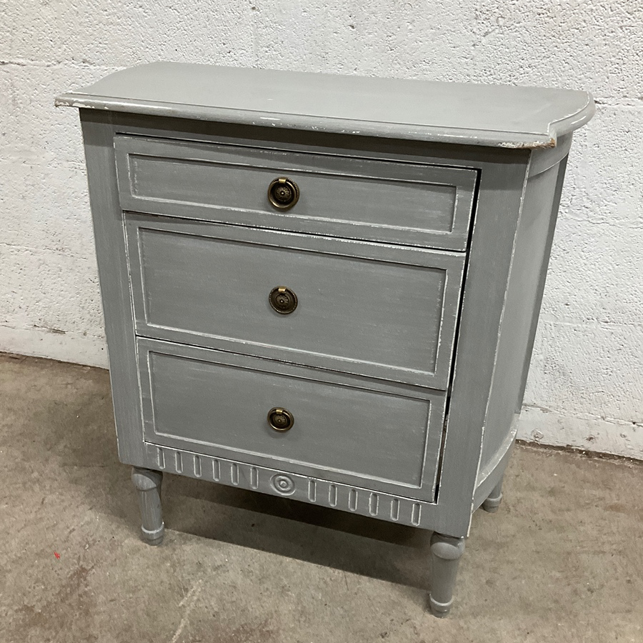 A vintage-style gray chest with three drawers. Ideal for bedrooms or living rooms. Made of wood with brass handles.