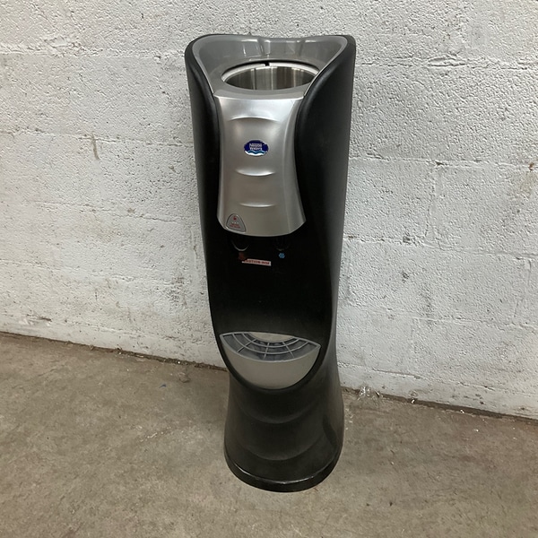 Freestanding water cooler with hot and cold functions, suitable for offices and homes. Sleek modern design.