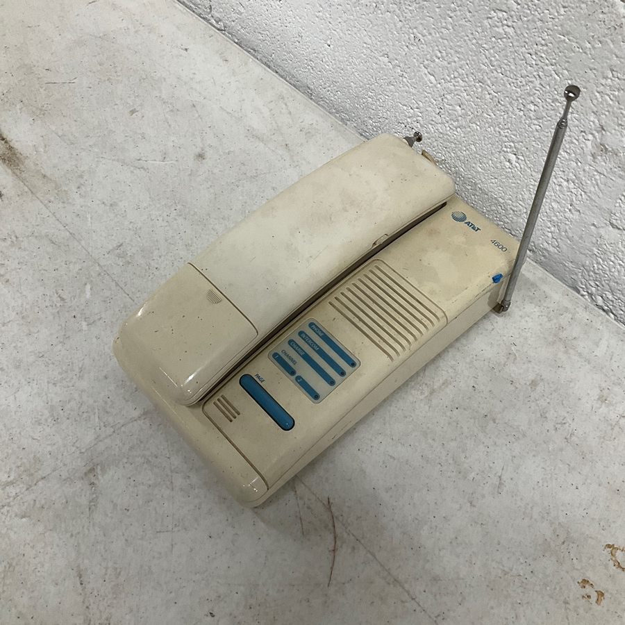 Retro AT&T cordless phone from the 1980s. Beige plastic with blue buttons. Ideal for nostalgic decor or collections.