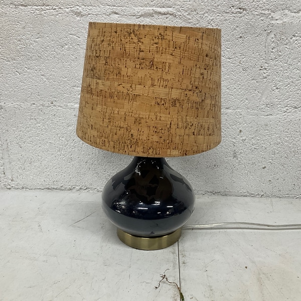 Modern table lamp with a cork shade and glossy ceramic base. Ideal for living rooms and bedrooms.