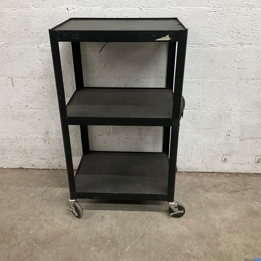 Sturdy metal utility cart with three shelves. Ideal for garage or workshop use. Features swivel casters for easy mobility.