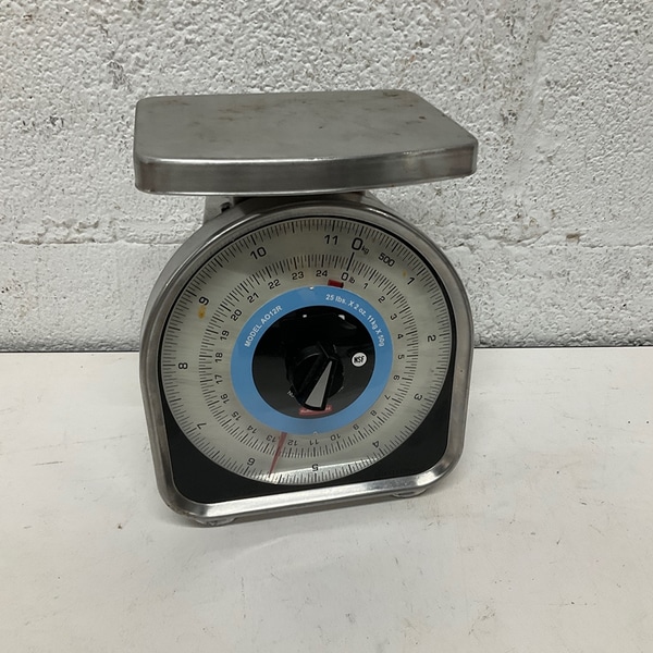Vintage analog kitchen scale in stainless steel with a dial display, ideal for accurate recipe measurements.
