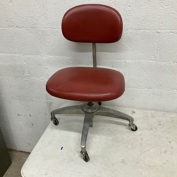 Mid-century modern office chair with red vinyl upholstery and metal frame. Features caster wheels for easy mobility.