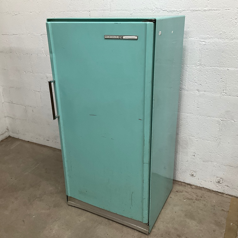 Aqua colored upright refrigerator, likely from the mid-20th century. Ideal for adding a retro flair to kitchens or living spaces.