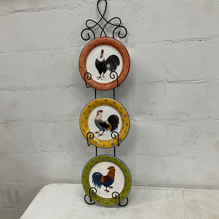 Trio of decorative ceramic plates featuring rooster designs, mounted on an elegant black metal stand suitable for kitchens or dining rooms. ...