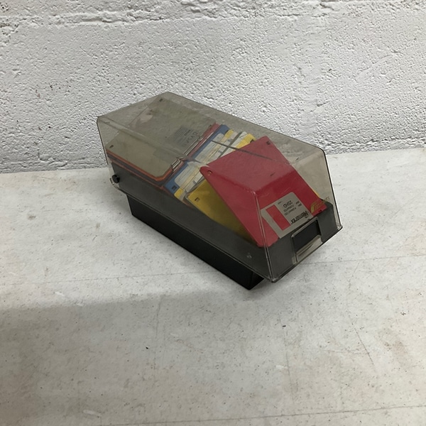 Vintage storage box for 5.25-inch floppy disks. Ideal for organizing and protecting diskettes. Perfect for office or retro tech decor.
