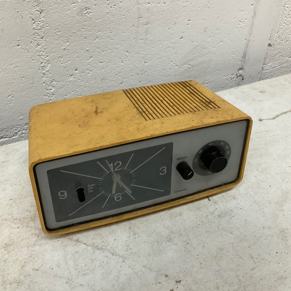 Retro 1970s yellow analog alarm clock radio with classic design. Great for bedrooms or collectors.