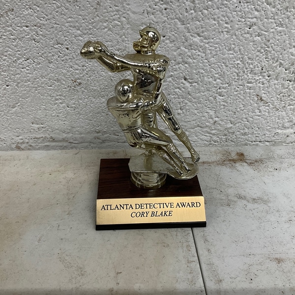 Silver wrestling trophy featuring two figures on a wooden base. Suitable for sports awards and decorations.