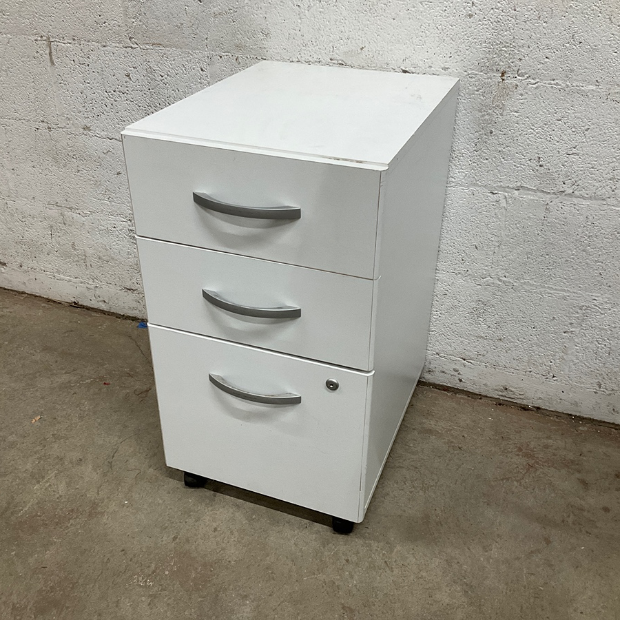 Compact filing cabinet on wheels, ideal for office spaces. Durable metal with three drawers.