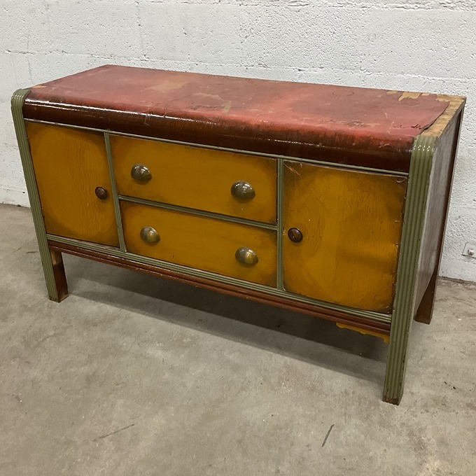 This mid-century sideboard cabinet is perfect for adding a vintage touch to living rooms or dining areas. Made of wood with a metal frame.