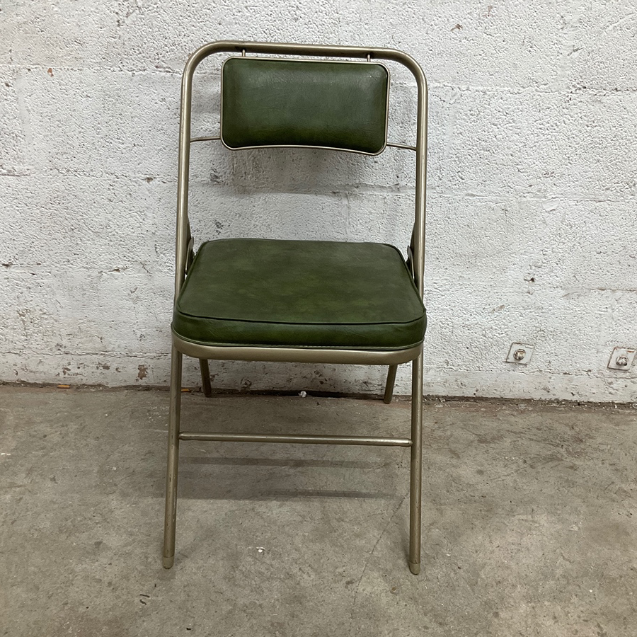 Mid-century metal folding chair with green faux leather seat, ideal for living rooms or dining spaces.