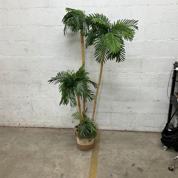 Tall artificial palm tree in woven basket, perfect for home or office decor.