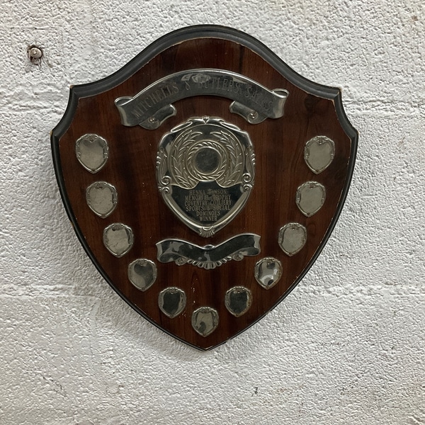 Decorative wooden shield plaque with metal accents. Ideal for awards or historical displays. Suitable for various rooms.