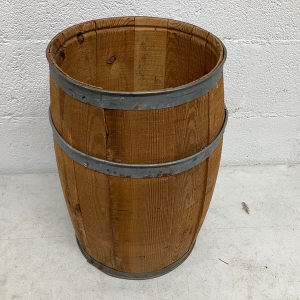 A wooden barrel ideal for rustic decor or storage. Features two metal hoops for reinforcement. Suitable for dining or living areas.