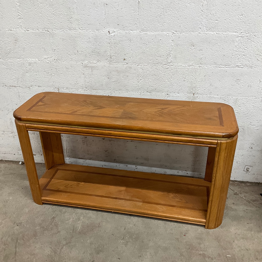 Mid-century console table with shelf, ideal for living rooms or entryways. Features warm wood tones.