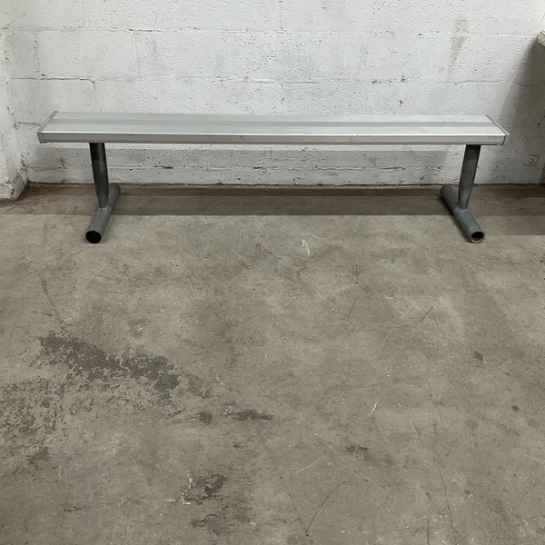 Durable aluminum locker room bench ideal for gym or school locker rooms. Simple and sturdy design fits industrial spaces.