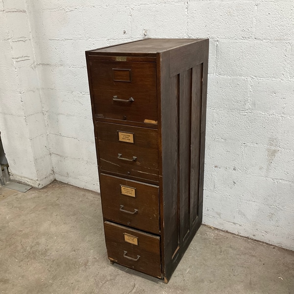Vintage wooden filing cabinet with four drawers. Ideal for office or home with a rustic and antique interior design.