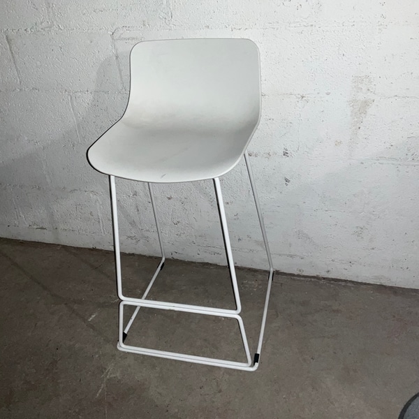 Sleek white bar stool with a minimalist design, ideal for contemporary kitchens or bars. Features a sturdy metal frame and comfortable seat.