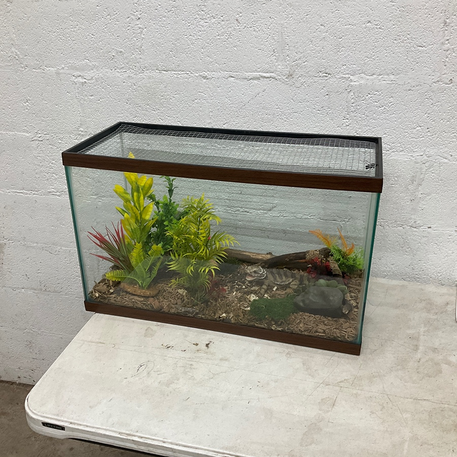 Rectangular glass terrarium with faux plants, wood decor. Ideal for home decoration or as a reptile habitat setup.