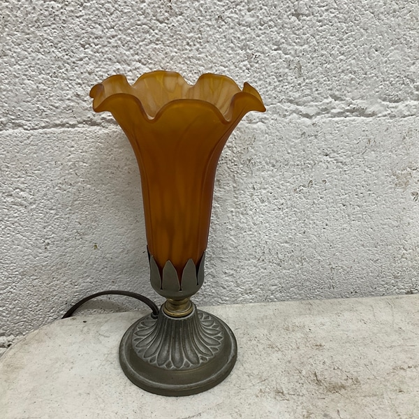 Elegant table lamp with amber glass shade. Perfect for art deco themed rooms. Features a metal base.
