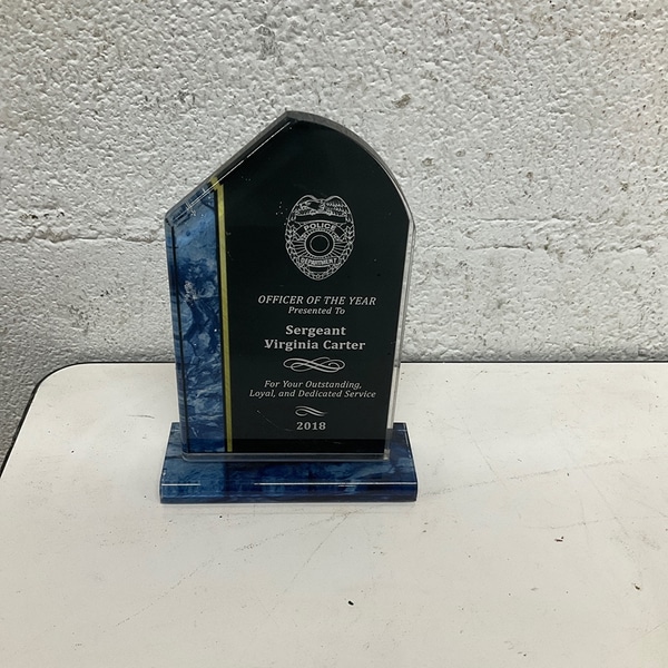 Glass award for police officer. Features police badge, personalized engraving, and year. Suitable for display in offices or homes.