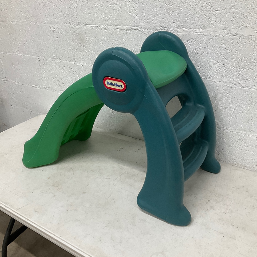 Green plastic slide from Little Tikes, ideal for toddlers. Sturdy design, perfect for indoor or outdoor play.