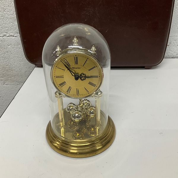 Classic dome anniversary clock with brass accents. Ideal for mantle or desk decor in vintage-themed rooms.