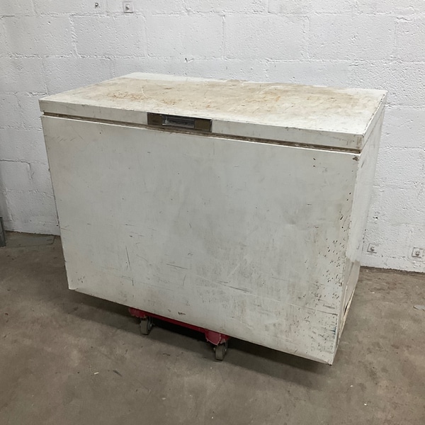 Spacious metal storage chest with a durable white finish, ideal for tools or workshop supplies.