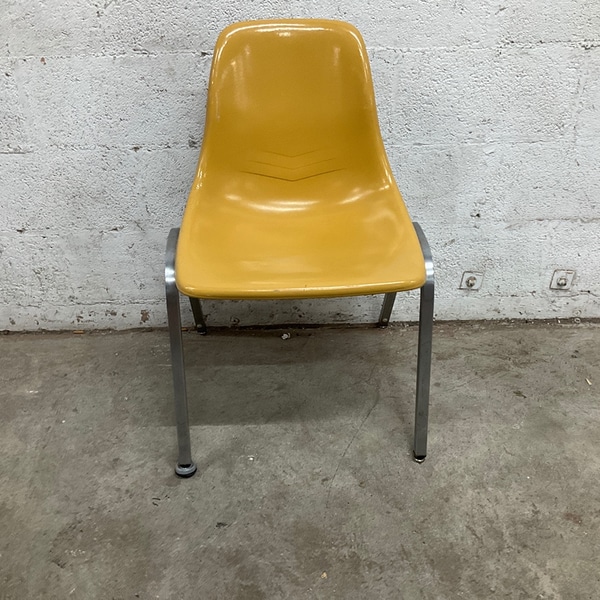 Vintage-style yellow plastic shell chair with metal legs. Ideal for dining rooms or offices.