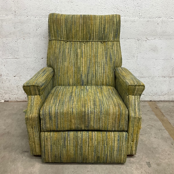 1970s vintage recliner with green textured fabric. Ideal for living rooms or retro-inspired spaces.