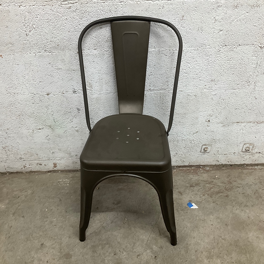 Metal dining chair with a vintage industrial style, perfect for kitchens or dining rooms.
