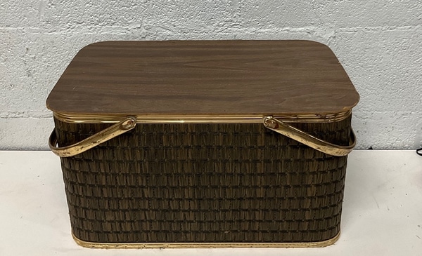 Wicker storage basket with hinged wooden lid. Ideal for rustic or vintage decor in living rooms or bedrooms.